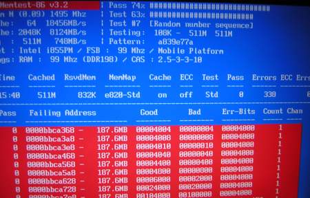 اضغط burn وسوف يتم نقل البرنامج الي قرص CD بالشكل المطلوب. بعد ذلك اعد إقلاع النظام وليتم الإقلاع من القرص بدلا من الهارد. سوف ترى أن البرنامج قد بدأ بالعمل ويخبرك بعدة خيارات, فقط عليك اختيار رقم 1 للإختبار الإفتراضي. ان كان وضع الذواكر سليم فلن تجد أن هناك اخطاء قد وجدت للذواكر التي لديك, بينما أن كان لديك احد الذواكر تعاني من خطأ ما فسوف يعطيك خطأ كما تشاهد في الصورة. ولكي يكون اختبارك صحيح اختبر كل ذاكرة على حدى حتى تعرف بالضبط اي من ذواكرك تعاني من مشكلة.
